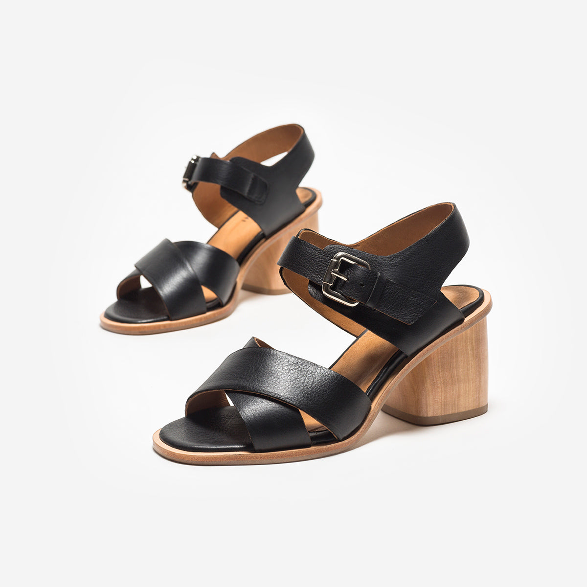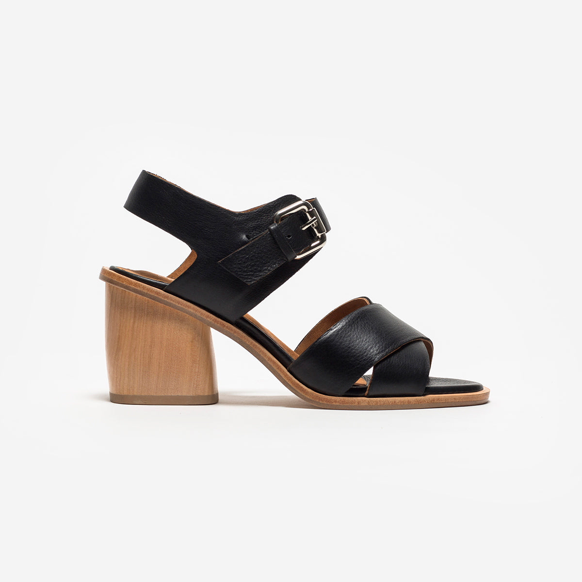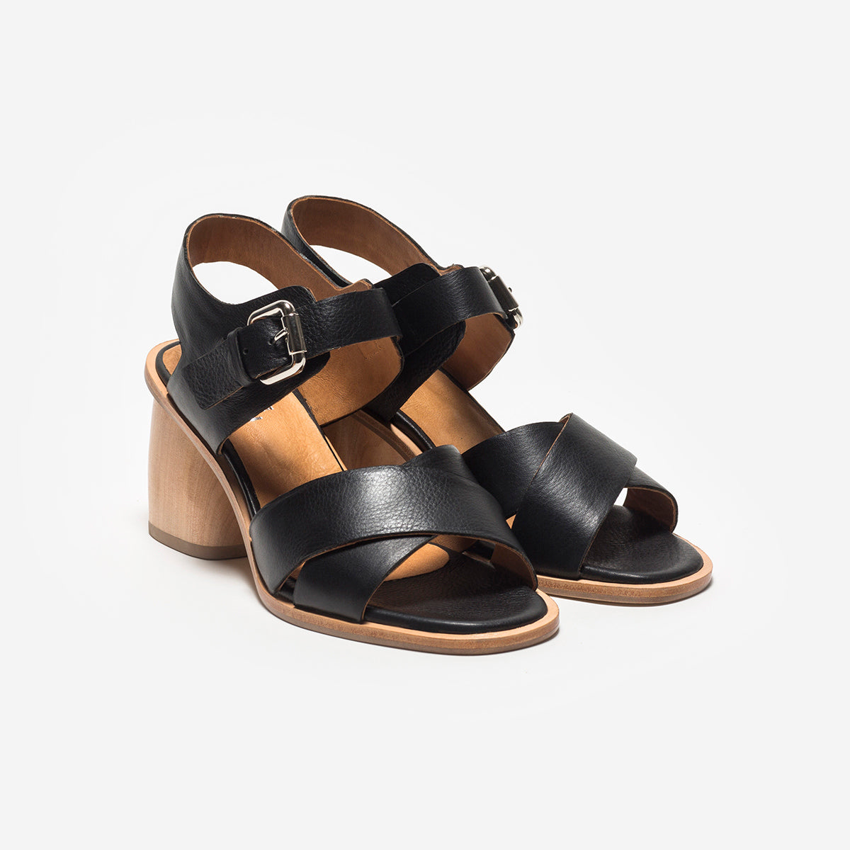 Sandalia Adele cuero negro, interior y plantilla de cuero. Taco de madera de 8cm.