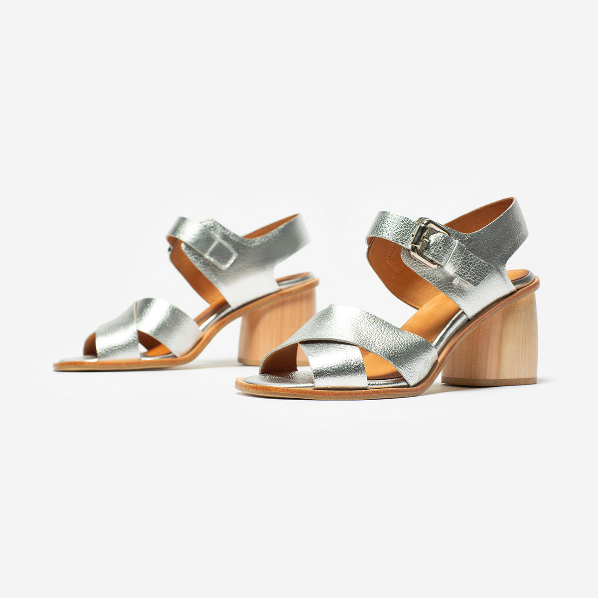 Sandalia Adele cuero plateado, interior y plantilla de cuero. Taco de madera de 8cm.