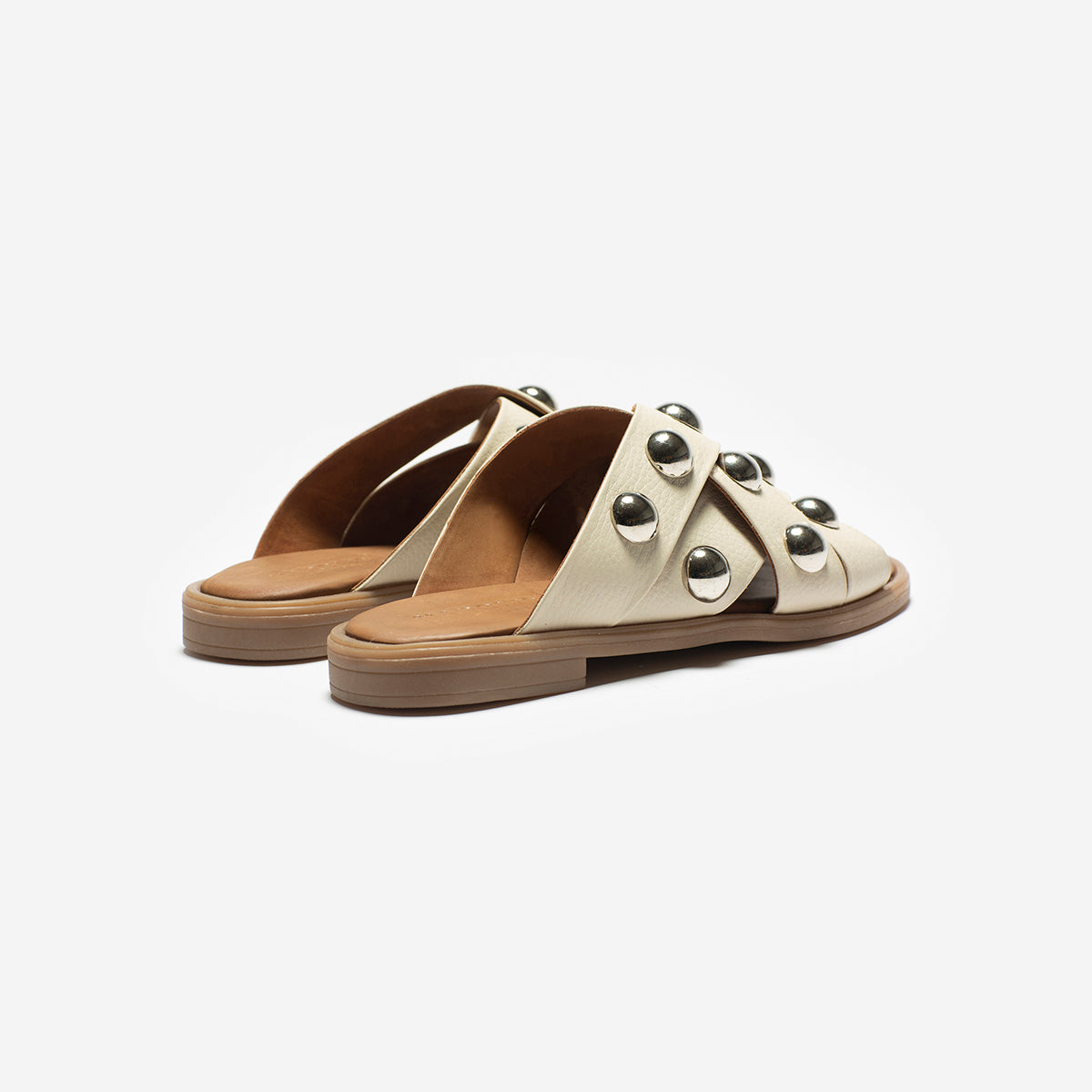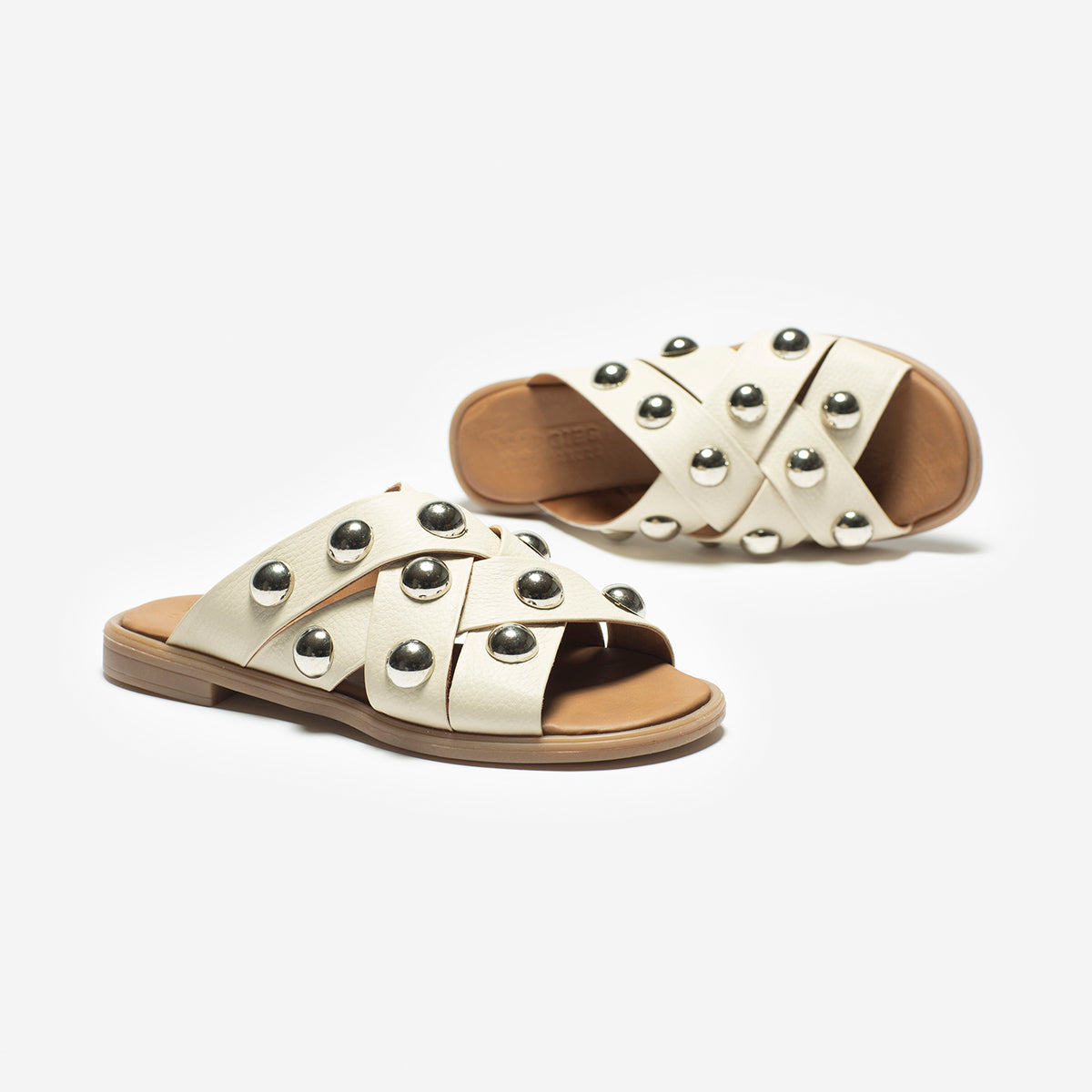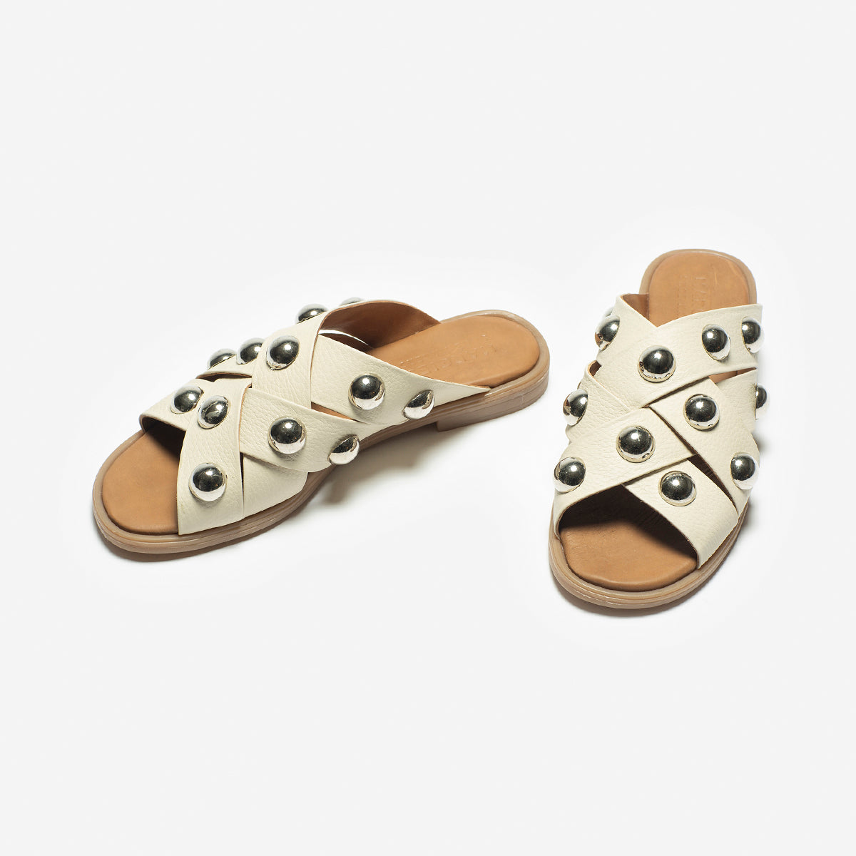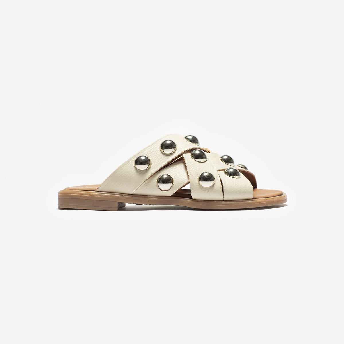 Sandalia Akira Off White, base 1 cm, interior y plantilla de cuero.