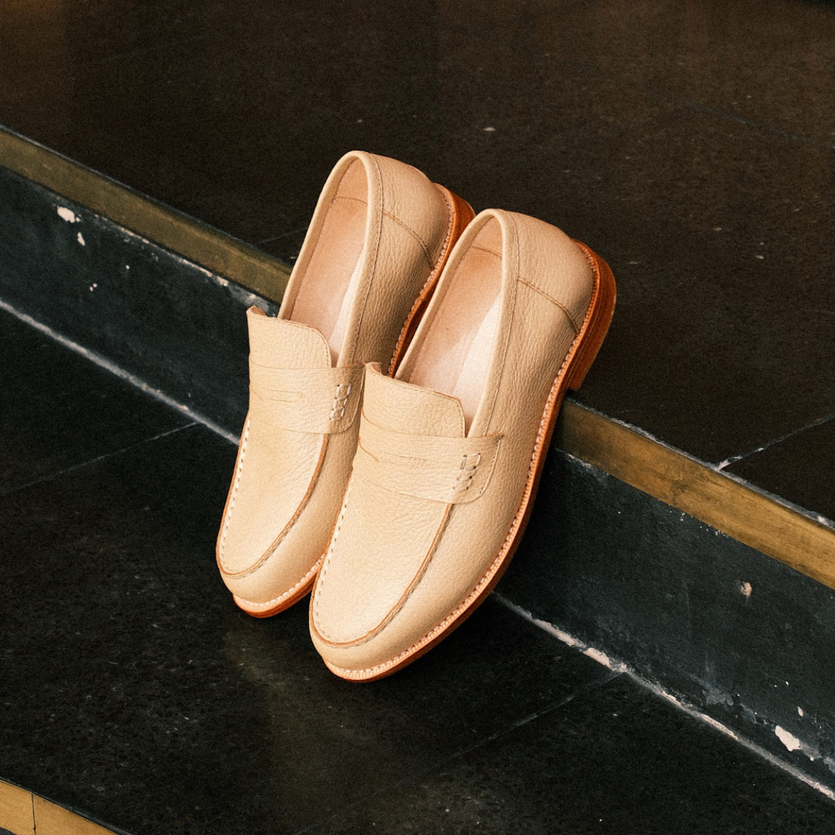 Mocasín Ciro Off White, exterior, interior y plantilla de cuero. Base de 2cm de alto