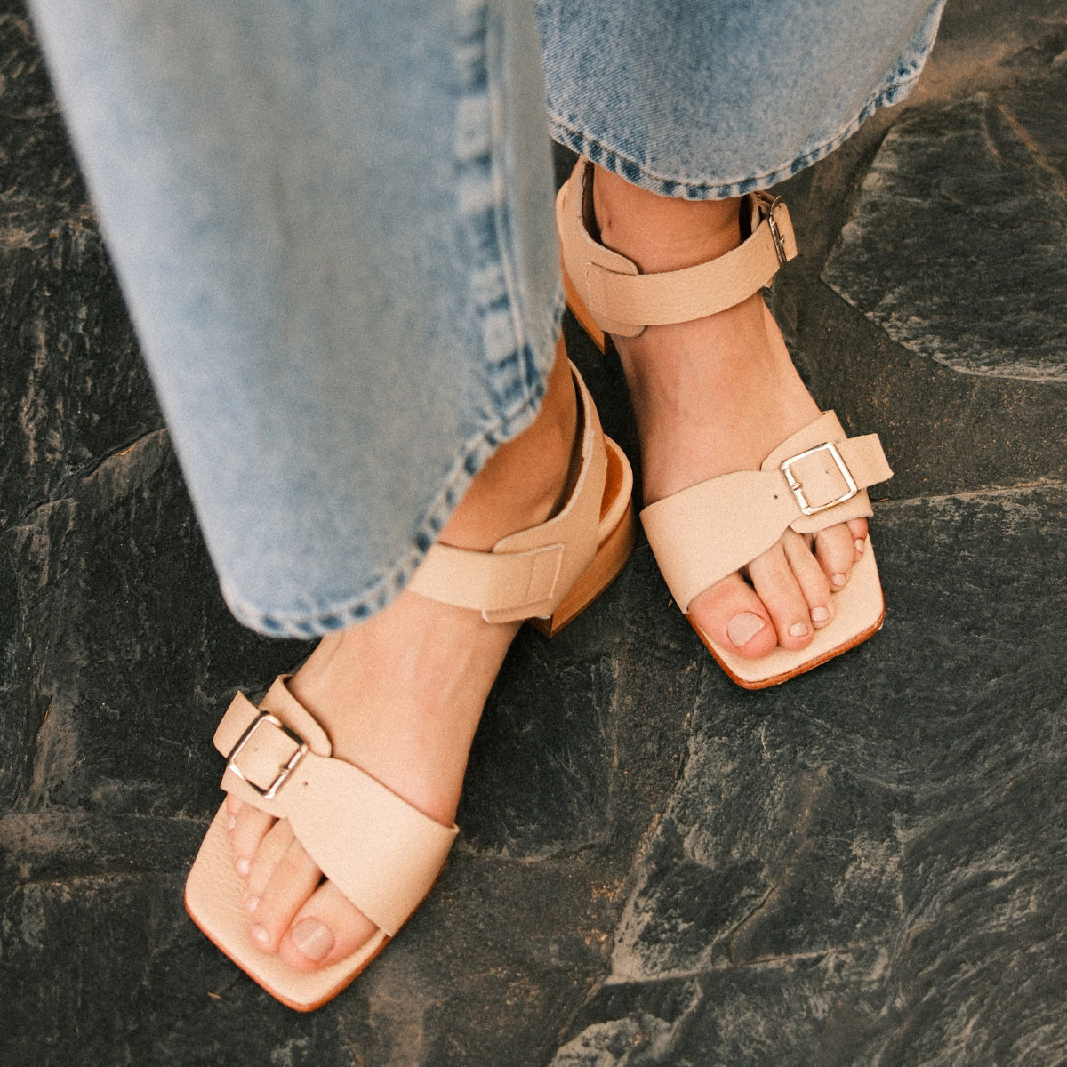 Sandalia Marvao Nude, interior y plantilla de cuero. Taco de madera de 4 cm.